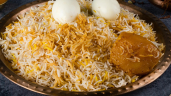 Egg Biryani is a flavorful dish featuring fragrant basmati rice, aromatic spices, and perfectly cooked eggs, creating a delicious and satisfying meal.