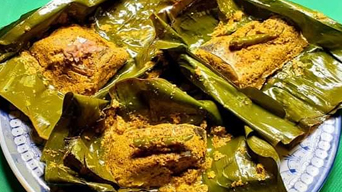 Ilish Paturi is a traditional Bengali delicacy where hilsa fish is marinated in mustard paste, wrapped in banana leaves, and steamed to perfection.