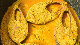 Shorshe Ilish is a classic Bengali dish featuring hilsa fish cooked in a rich mustard gravy, infused with aromatic spices.